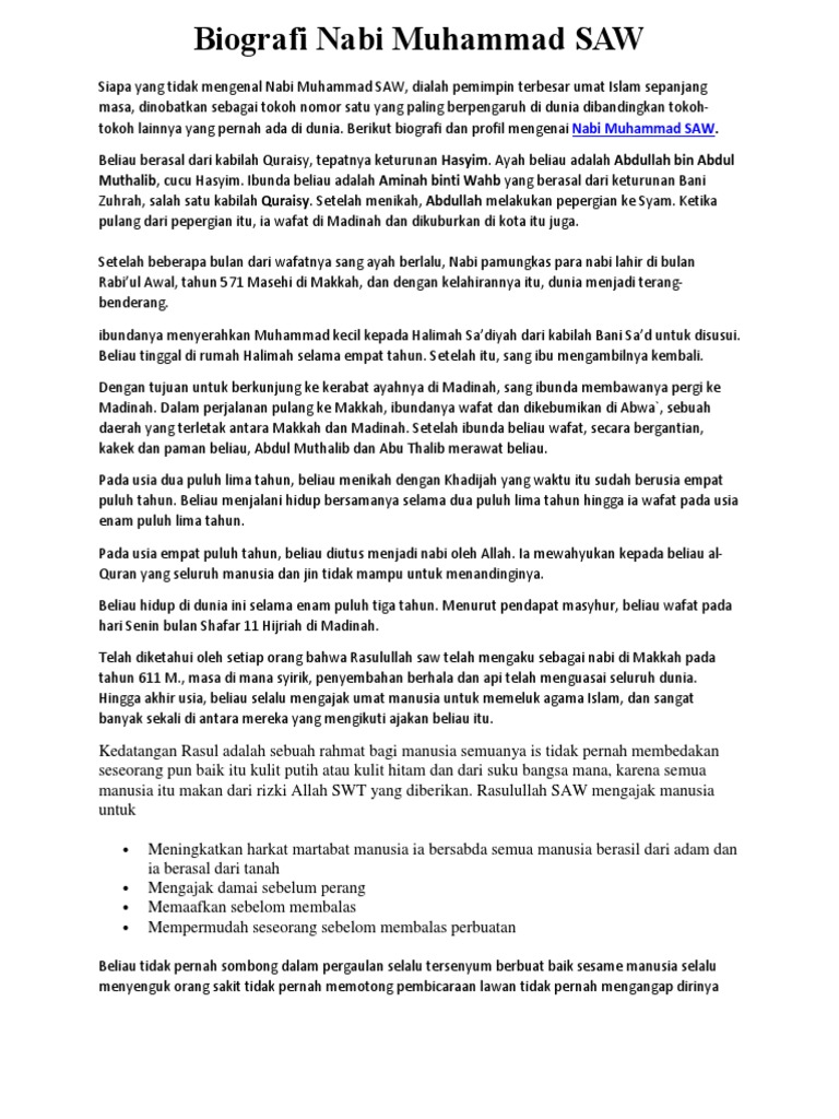 Berikut adalah ringkasan tentang biodata nabi yang kamu harus tahu ok. Rasul terakhir yang diutus allah swt untuk menyampaikan ajaran islam ini berhasil menjadi panutan umat muslim seluruh dunia. Mekkah, arab saudi, senin, 12 rabiul awal 570 m wafat : Halaman blog yang terbatas ini tidaklah mungkin dapat menyajikan kisah nabi muhammad saw. Tentu akhlaknya yang mulia menjadi tauladan bahkan tidak hanya untuk muslim, meski beliau sudah meninggal dunia.