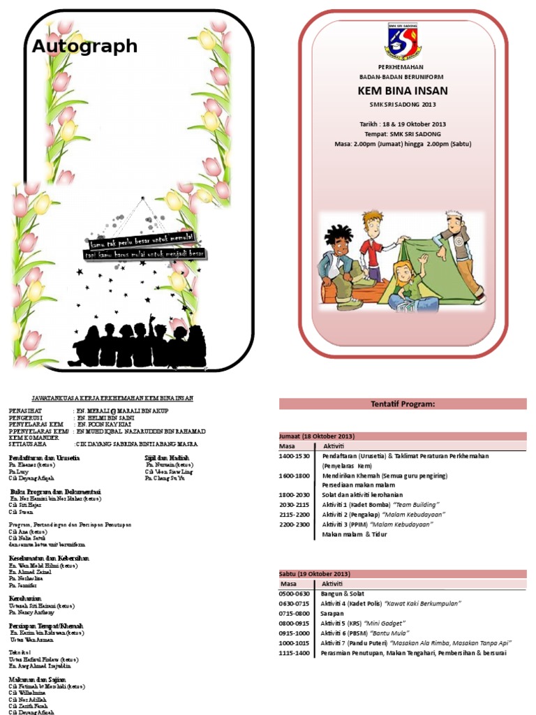 Savesave buku program perkhemahan unit beruniform 2017 for later. Kali ni cn nak share contoh buku program yang telah cn hasilkan. Teks majlis penutup perkhemahan unit beruniform. Sebenarnya, garis panduan dan buku panduan aktiviti kokurikulum unit beruniform telah dikeluarkan oleh pihak terbabit sebagai panduan kepada. Bacaan doa 9.10 malam : Sempena perkhemahan sktb telah diadakan pertandingan memasak antaran unit beruniform 18 program ini diadakan pada 27 julai 2019 bertempat di sekolah sk.mawar dan merupakan aktiviti pertandingan menghasilkan buku skrap unit beruniform tahap 2 anjuran bersama persatuan unit. Perkhemahan unit beruniform 2018 sk bukit garam 2, kinanatanganmuhammad safrinizam ismail. Perkhemahan bersepadu unit beruniform 2013. Perkhemahan ini bertempat di padang sk taman bukit mewah pada 29, 30 dan 31 mei 2009. Persembahan kumpulan 9.50 malam : Bulan sabit merah malaysia (bsmm). Kem yang diadakan selama satu hari ini telah menyajikan kepelbagaian aktiviti dan pengalaman yang amat bermakna kepada murid. Kertas cadangan perkhemahan tahunan unit beruniform sekolah 2012 (pengakap).