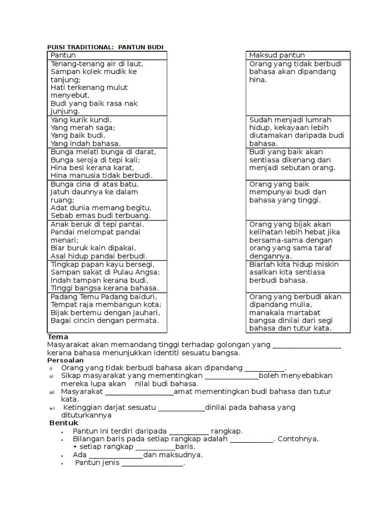 Pt3, secondary 2 bahasa malaysia, alpha+ komsas antologi baik budi, indah bahasa. Download as docx, pdf, txt or read online from scribd. Good, kind orang baik good person, kind person 2. Utang tiap helai bulu (artinya utangnya banyak sekali). Hujan emas di negeri orang, hujan batu di.