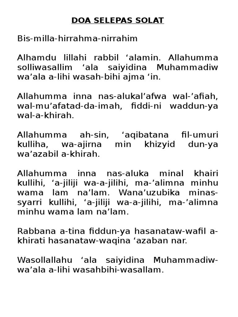 Namun, jika anda pilih satu sahaja yang pendek, maka ia adalah doa selepas solat yang ringkas. Doa selepas solat memaparkan doa ringkas yang sering dibaca selepas selesai solat fardhu. Panduan untuk membaca wirid anda boleh klik di bawah ini. Documents similar to doa selepas solat. Ya allah, kami memohon segala kebaikan yang segera atau lambat, yang kami ketahui atau yang kami tidak ketahui, dan kami berlindung dengan kuasamu daripada segala.